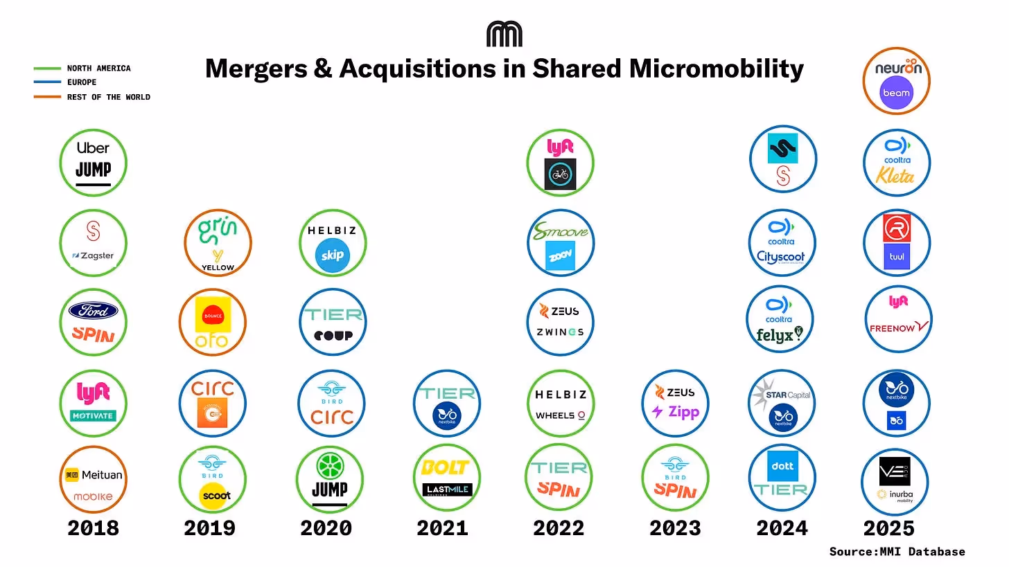 After cash-fueled growth and billion-dollar acquisitions in 2017-2019, tighter funding and weaker unit economics forced sub-scale operators to exit or merge from 2020 onward. Recent deals, including large operator mergers in Europe and Asia-Pacific, reflect a new phase focused on survival, scale, and long-term city contracts. By 2026, consolidation is no longer reactive but the primary way the shared micromobility industry grows.