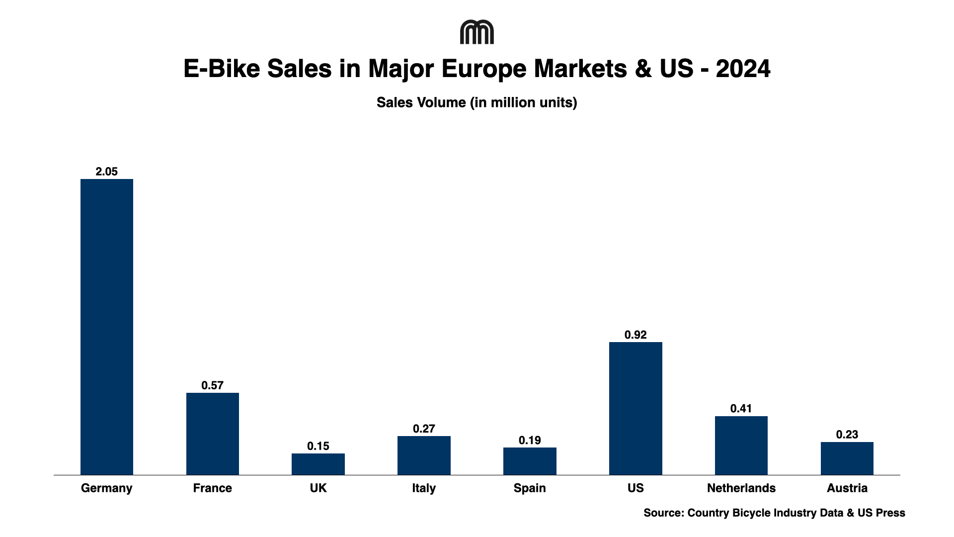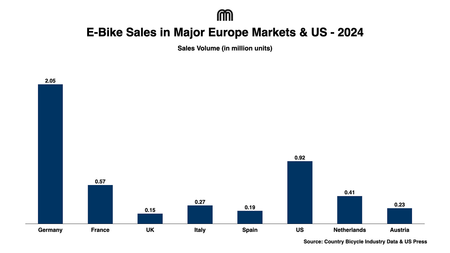 Micromobility Newsletter published on March 9 included a chart on "E-Bike Sales in Major European Markets & US – 2024" with incorrect figures, which has since been removed. The original chart incorrectly reflected total bicycle sales rather than e-bike sales only for several markets. The chart below reflects updated data. Please also note that U.S. figures are industry estimates, as official nationwide sales data is not publicly available.