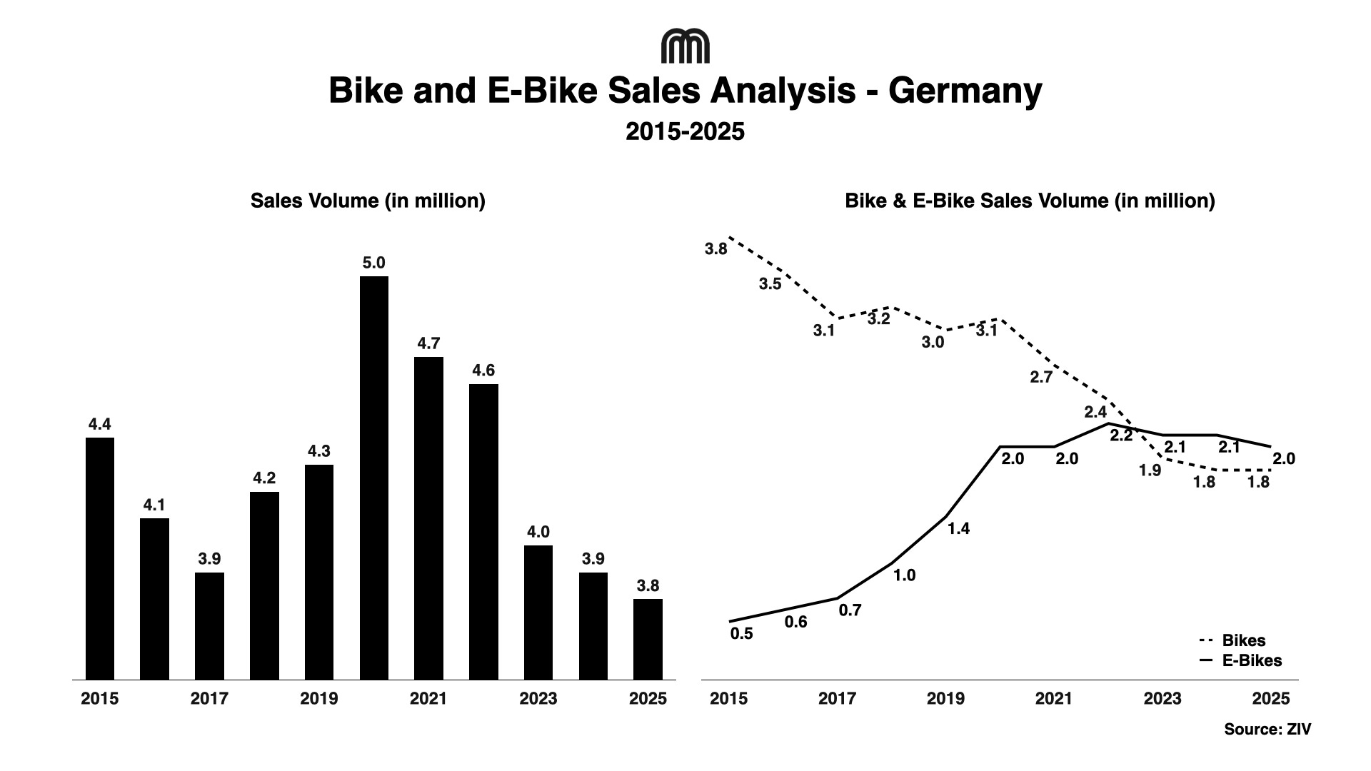 Total bicycle sales in Germany remained relatively stable in 2025, with 3.8m units sold, a 3.9% decline YoY. E-bikes continued to dominate the market with a 52.7% share, with around 2m units sold during the year.