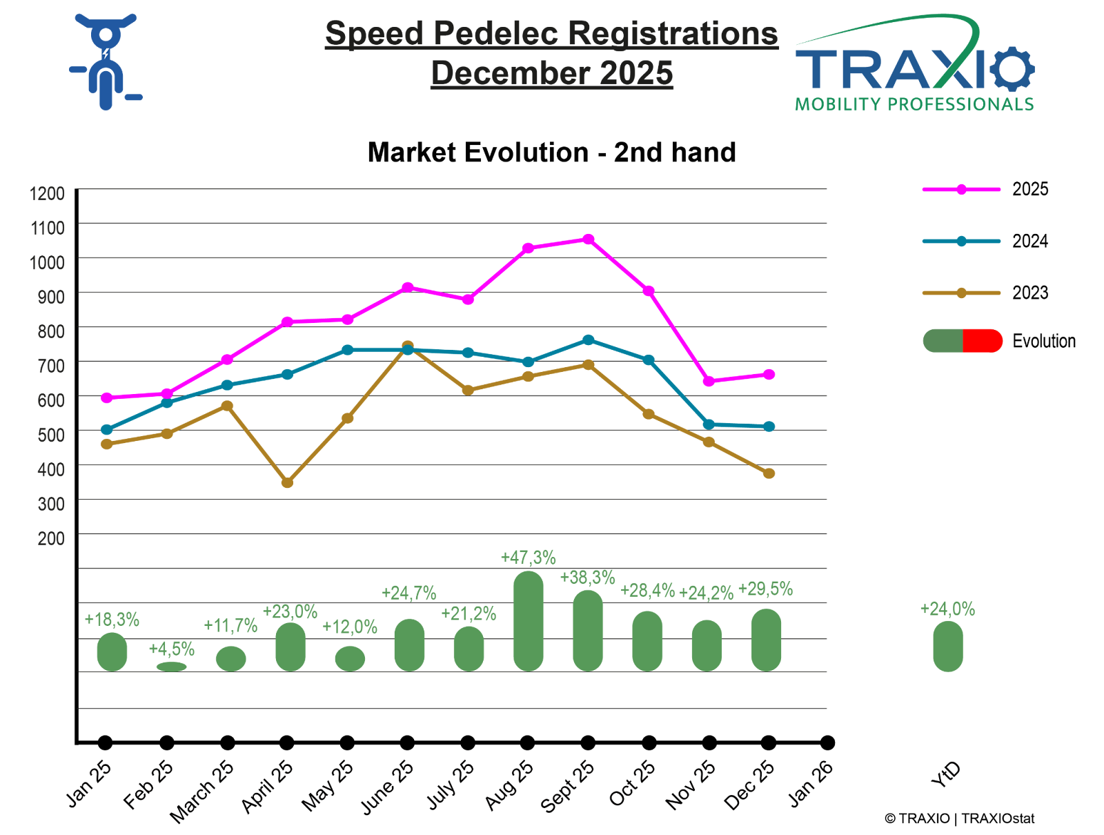 Second-hand registrations reached 9.6k units, an increase of 24% compared to the previous year, the highest level ever recorded for the segment. In total, second-hand bikes accounted for 40.6% of all speed pedelec registrations in 2025.