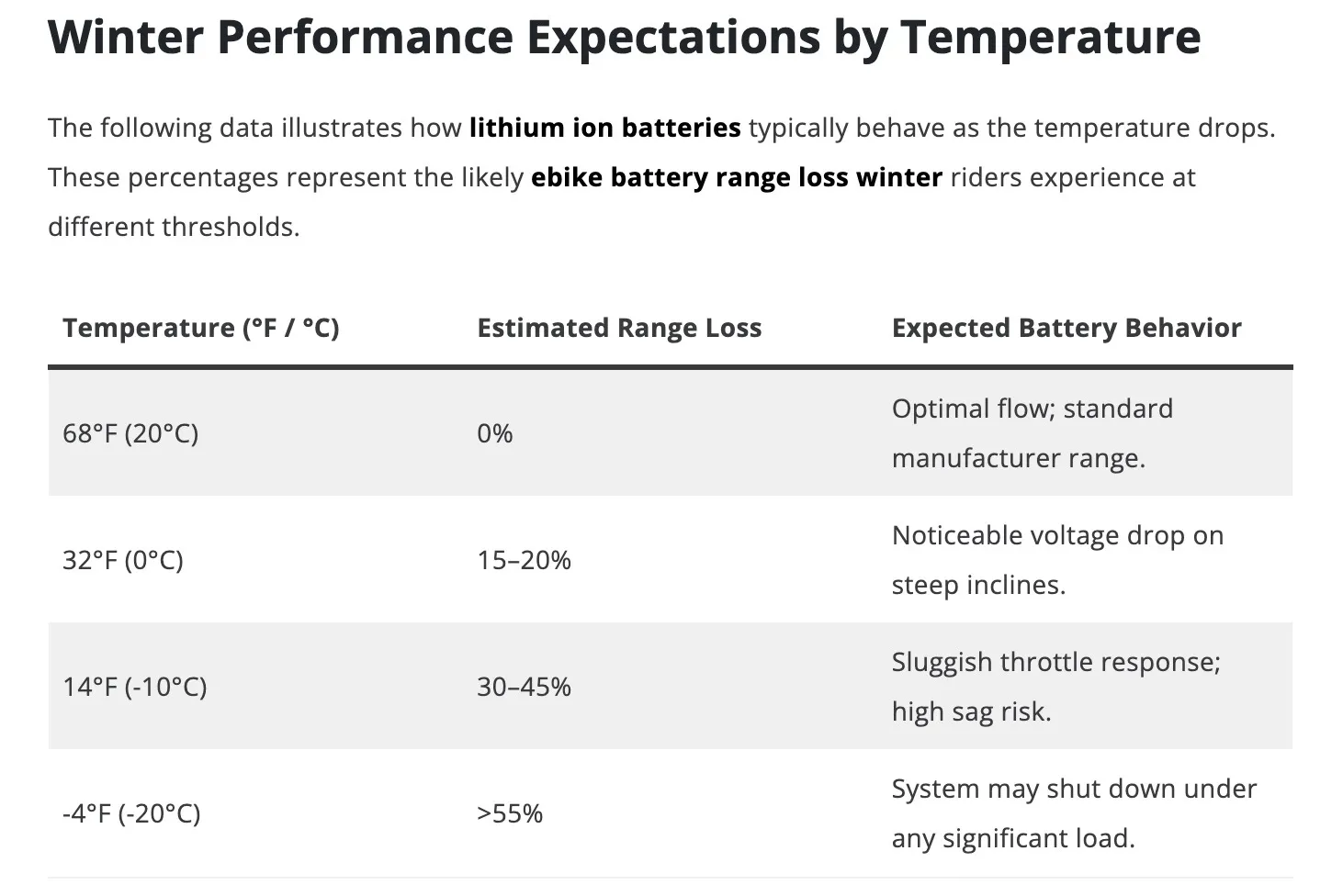 “Cold temperatures reduce battery activity and slow electrochemical reaction rates, leading to a significant increase in internal resistance, especially at low state of charge and low temperature, where resistance can increase by more than ten times. From a user perspective, this results in reduced power output and shorter range.”
