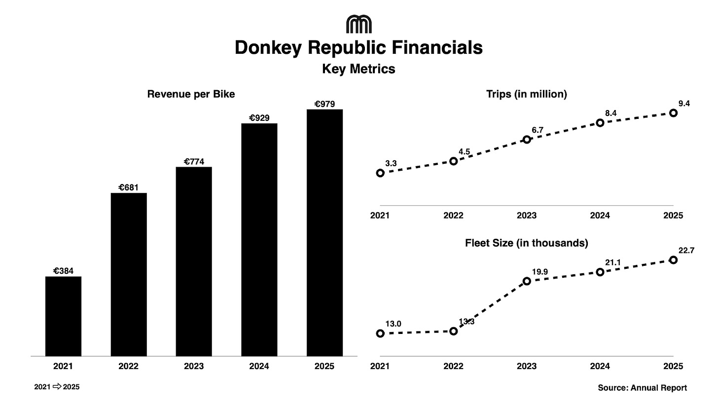 - Chart: Key Metrics (Revenue per Bike/Year, Trips, Fleet, 2021-2025)