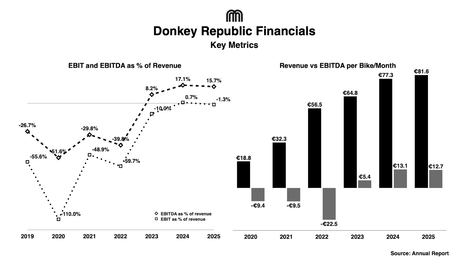 - Revenue vs. EBITDA per Bike/Month (2020-2025)