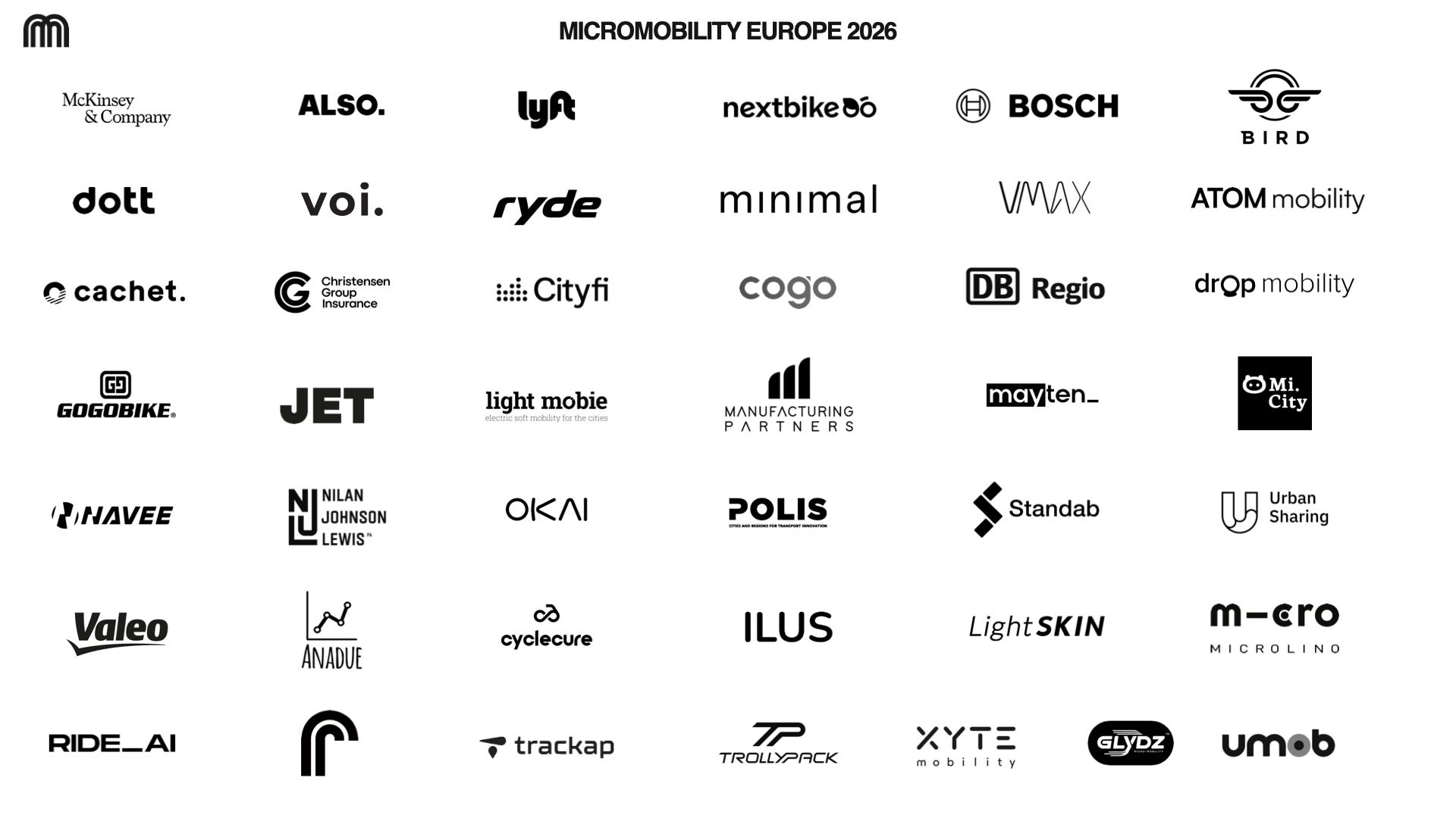 We’re proud to welcome an incredible group of early partners including McKinsey, Rivian’s ALSO, LYFT, RYDE, Dott, NextBike, POLIS, Urban Sharing, Navee, CityFi, Valeo, XYTE, Vmax, Microlino, Standab, Atom, alongside more companies joining us this year.