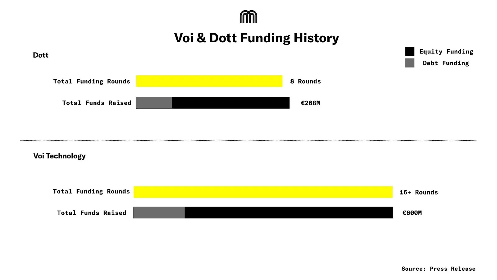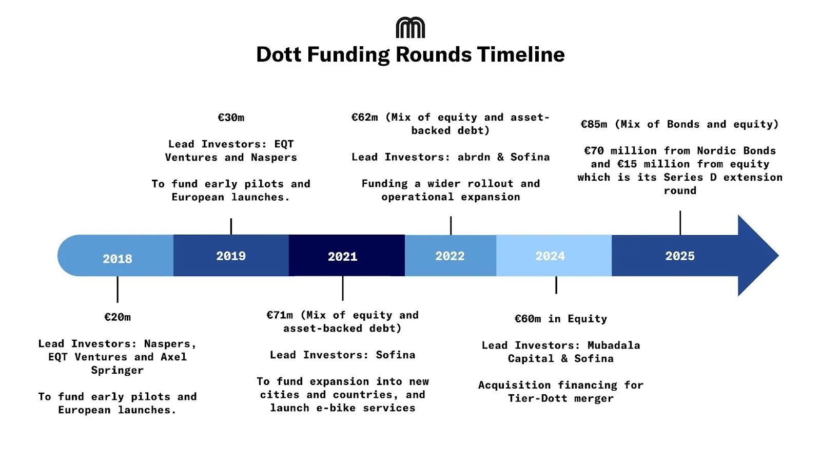 Dott has raised over €268m ($309m) through five major equity funding rounds, including initial seed/pre-Series A, Series A, a two-part Series B, and a Series D extension, while also leveraging asset-backed debt financing and bond issuance.