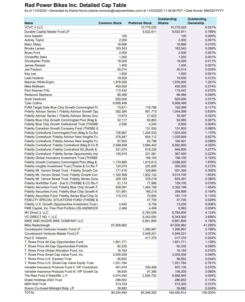 - Mike Radenbaugh holds 67,926,962 shares, representing 41.295% ownership