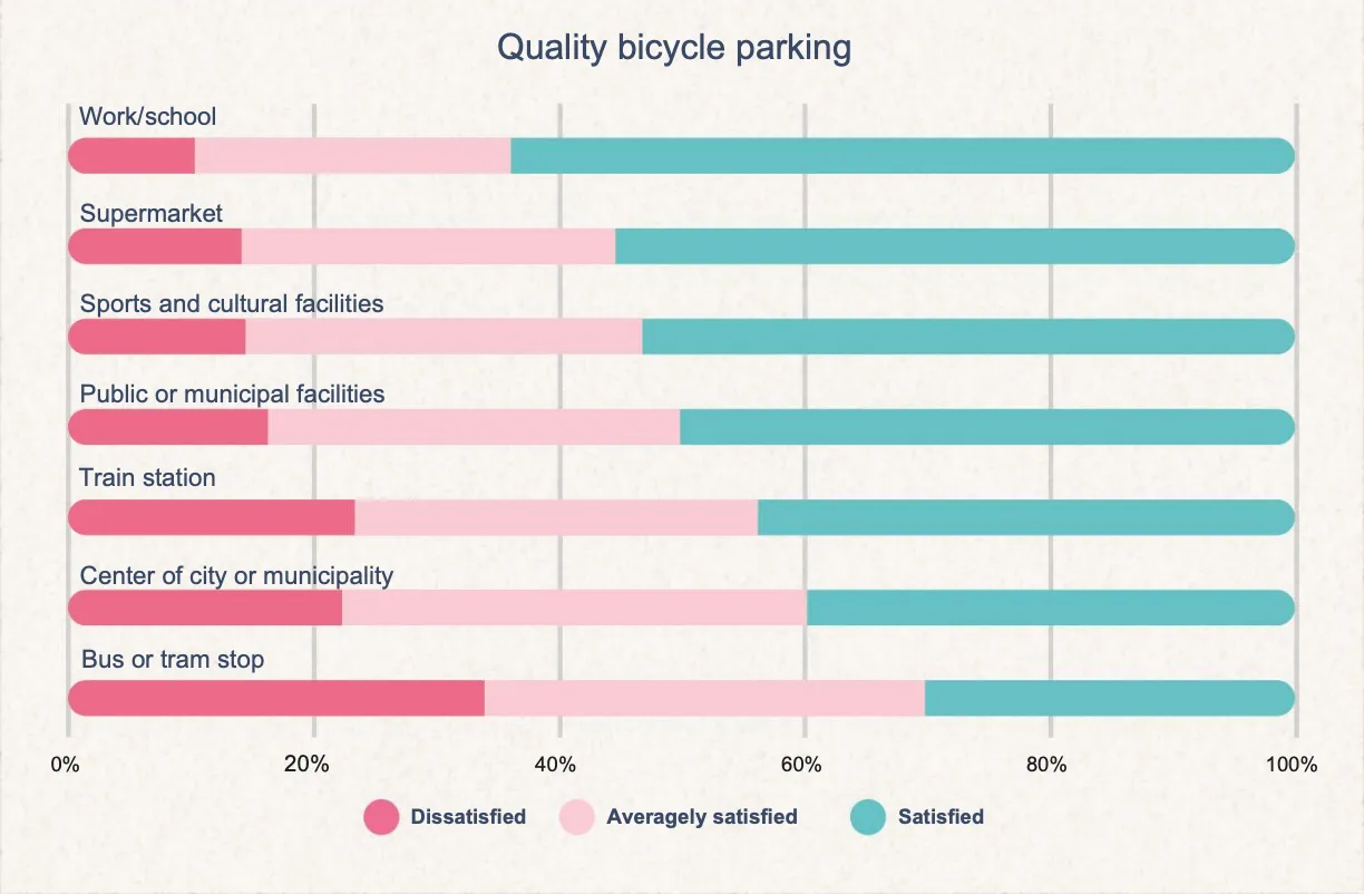 Parking is also a major hurdle. As bikes become more expensive, the need for secure, high-quality parking grows. Satisfaction remains lowest at train stations and bus stops, where many feel their bikes are at the highest risk.