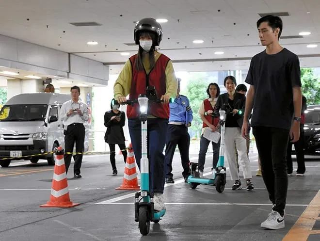 Students testing shared scooters in Tokyo (Photo credit: The Asahi Shimbun)