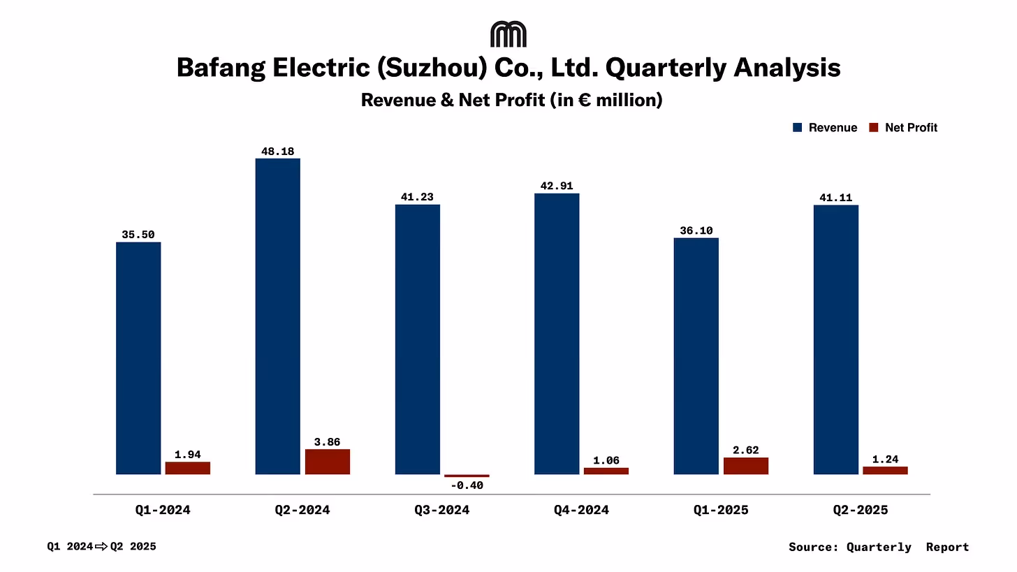 In the second quarter of 2025, Bafang’s revenue recovered to €41.11m from €36.10m in the previous quarter. However, its net profit saw a sharp decline, falling by more than half to €1.24m from €2.62m in Q1 2025.