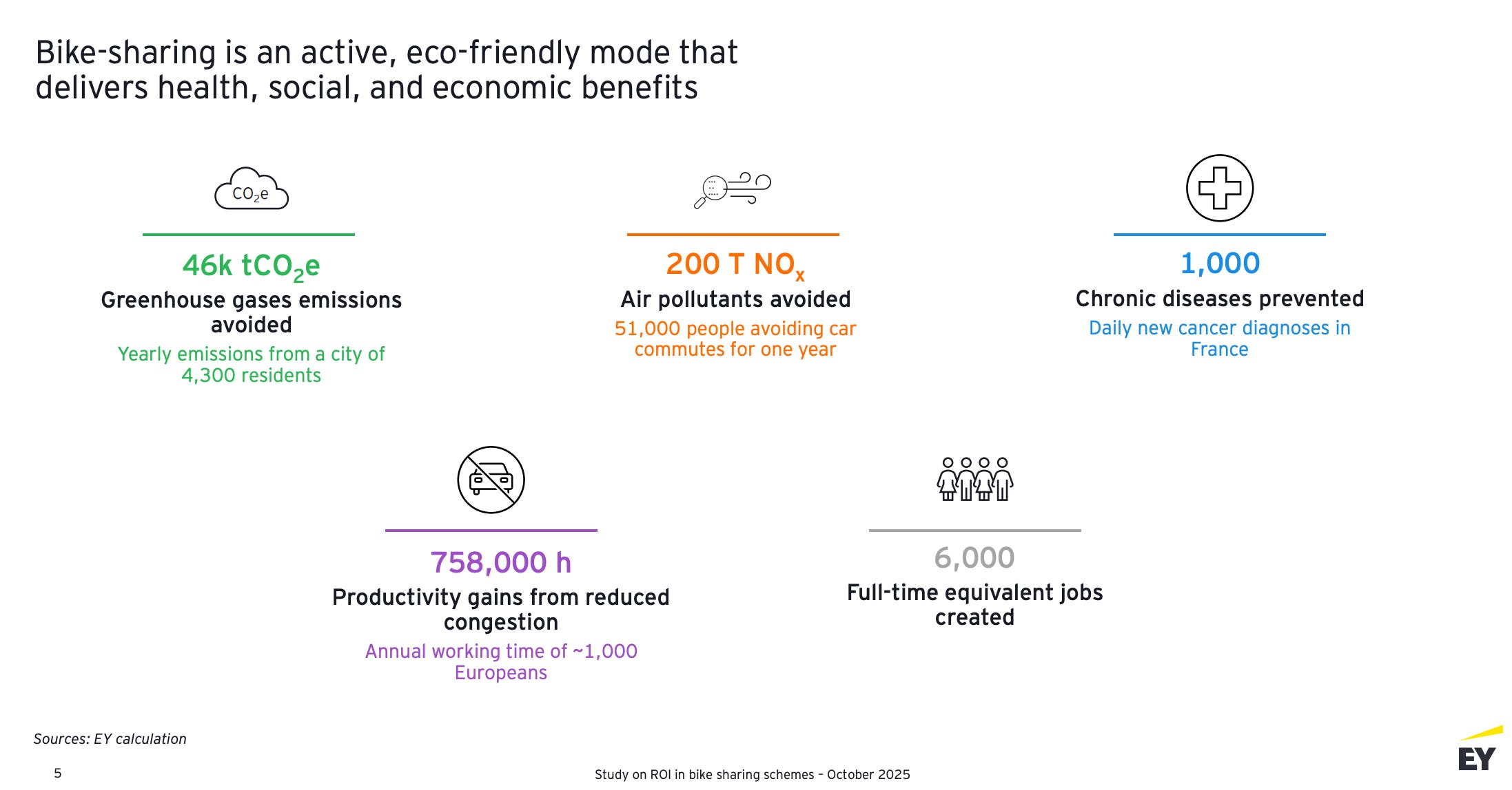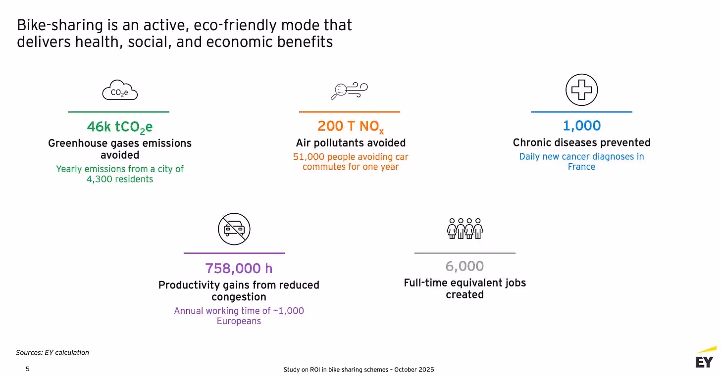 A study on European bike-sharing reveals it is a highly strategic public investment, currently delivering a 10% annual return by generating €305m in benefits. These include saving 46k tons of CO₂, preventing nearly 1k chronic diseases, reducing congestion, and supporting 6k jobs. The report further projects that with targeted expansion, these annual benefits could triple to €1 billion by 2030, boosting the return on investment to an exceptional 75% and solidifying bike-sharing’s role as a key tool for building healthier, more efficient, and economically vibrant cities.