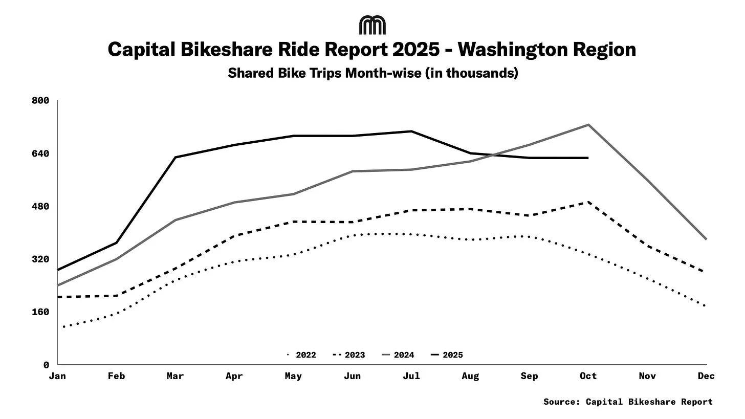 In the Greater Washington region, the Capital Bikeshare (CaBi) system saw a significant drop in October 2025, with trips falling 13.9% compared to October 2024, marking the second straight month of year-over-year decline. Despite the monthly slump, CaBi’s total ridership for 2025 rose 14.4%, reaching about 5.9m trips through October. Even with falling usage in recent months, the overall annual growth shows demand for bikesharing remains strong in the region, though short-term factors like a government shutdown and fare hikes likely affected ridership.