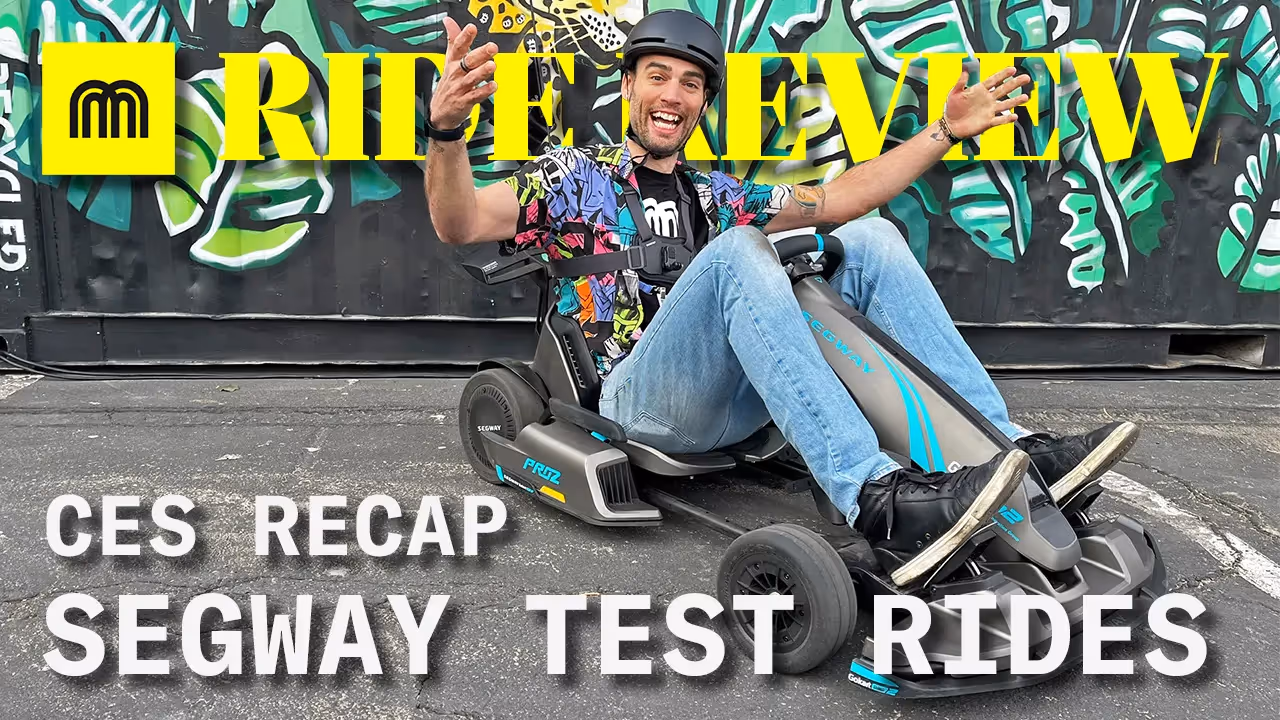 Our final day at the Consumer Electronics Show was all about Segway! Tyson left the show floor and trekked to Segway’s test track location, where they had assembled a variety of scooters, electric bikes, and even a go-kart for test rides. We were especially excited to see their new prototypes: The Xyber, an electric motorcycle masquerading as an electric bike, and the Xafari, a comfortable and sporty adventure e-bike.