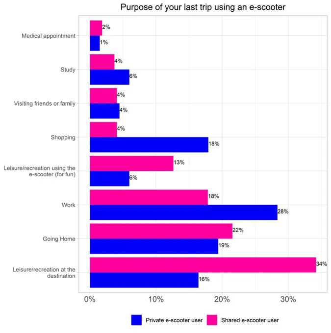 According to a new study, where you take your scooter depends on what kind of scooter you ride. For example, shared scooters are primarily ridden for leisure, while privately-owned scooters are more often used for commuting.