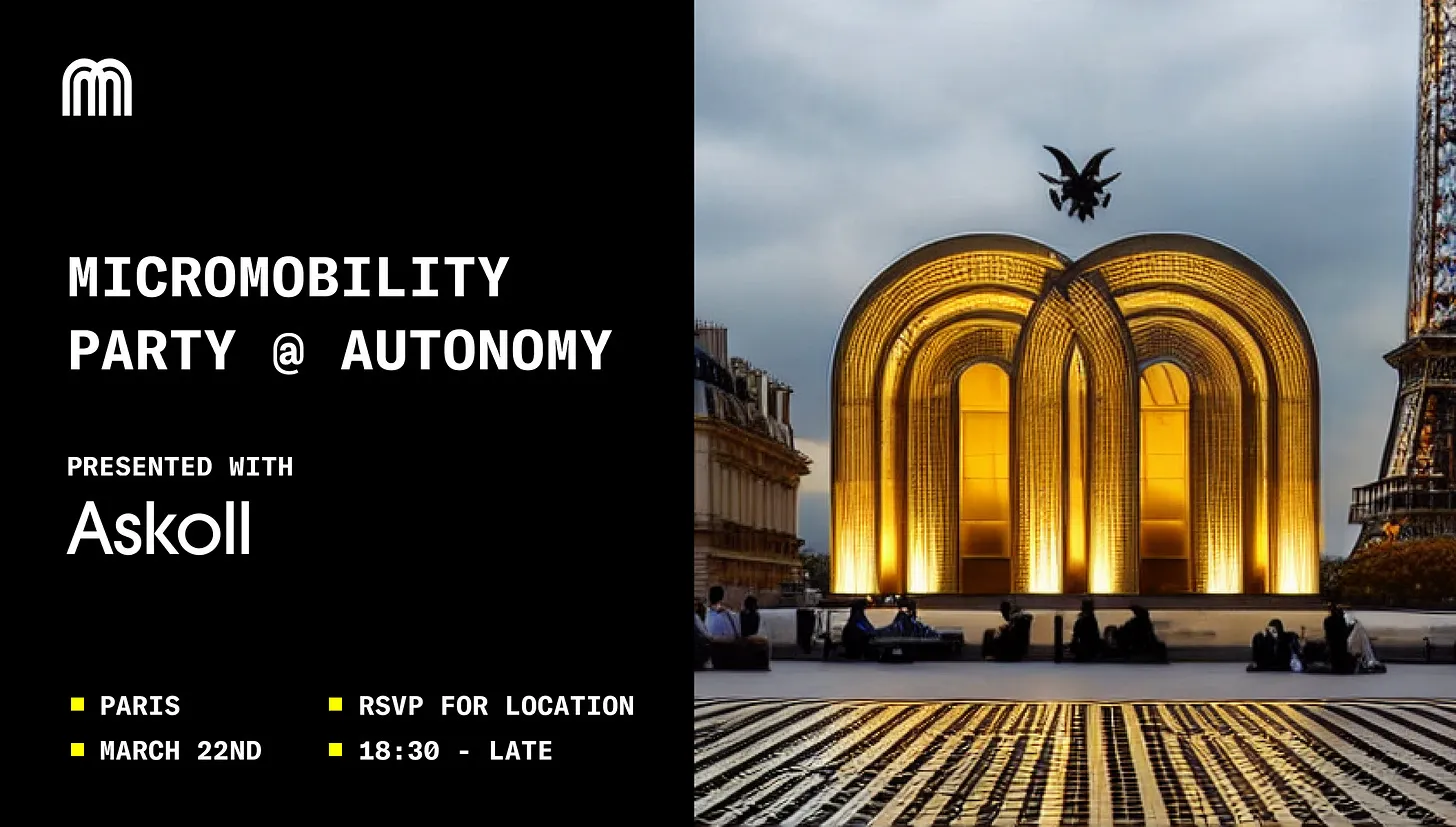 Micromobility is coming to Autonomy Paris! Naturally we want to see all our amazing European friends, so Askoll EVA and us are organizing a lively get-together on the evening of March 22nd. Location TBA. Someplace fun.