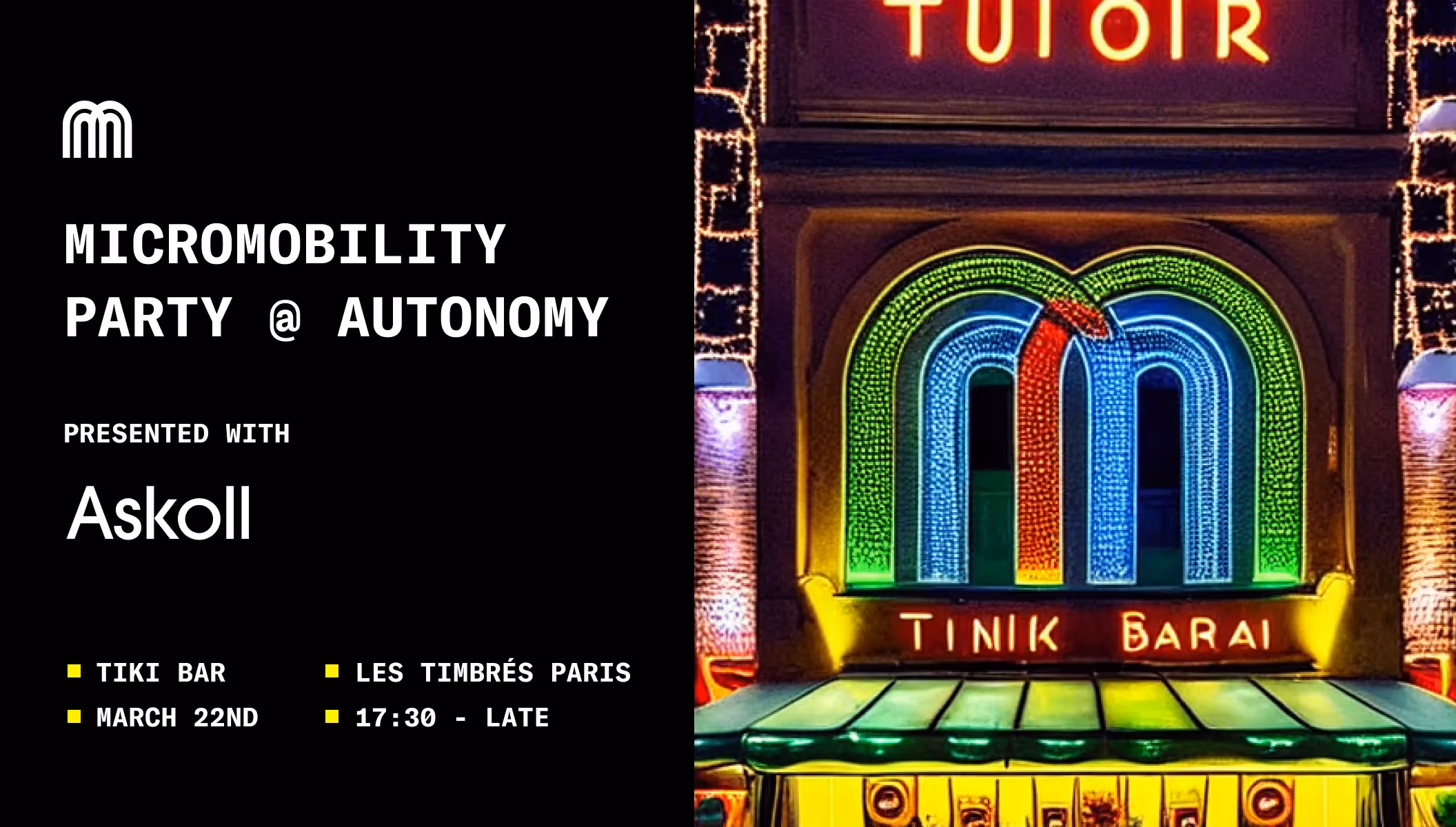 Micromobility is coming to Autonomy Paris! Naturally we want to see all our amazing European friends, so Askoll EVA and us are organizing a lively get-together on the evening of March 22nd at Les Timbrés. That's right. In the tradition of Hemingway in Paris, we're doing a tropical tiki bar :)