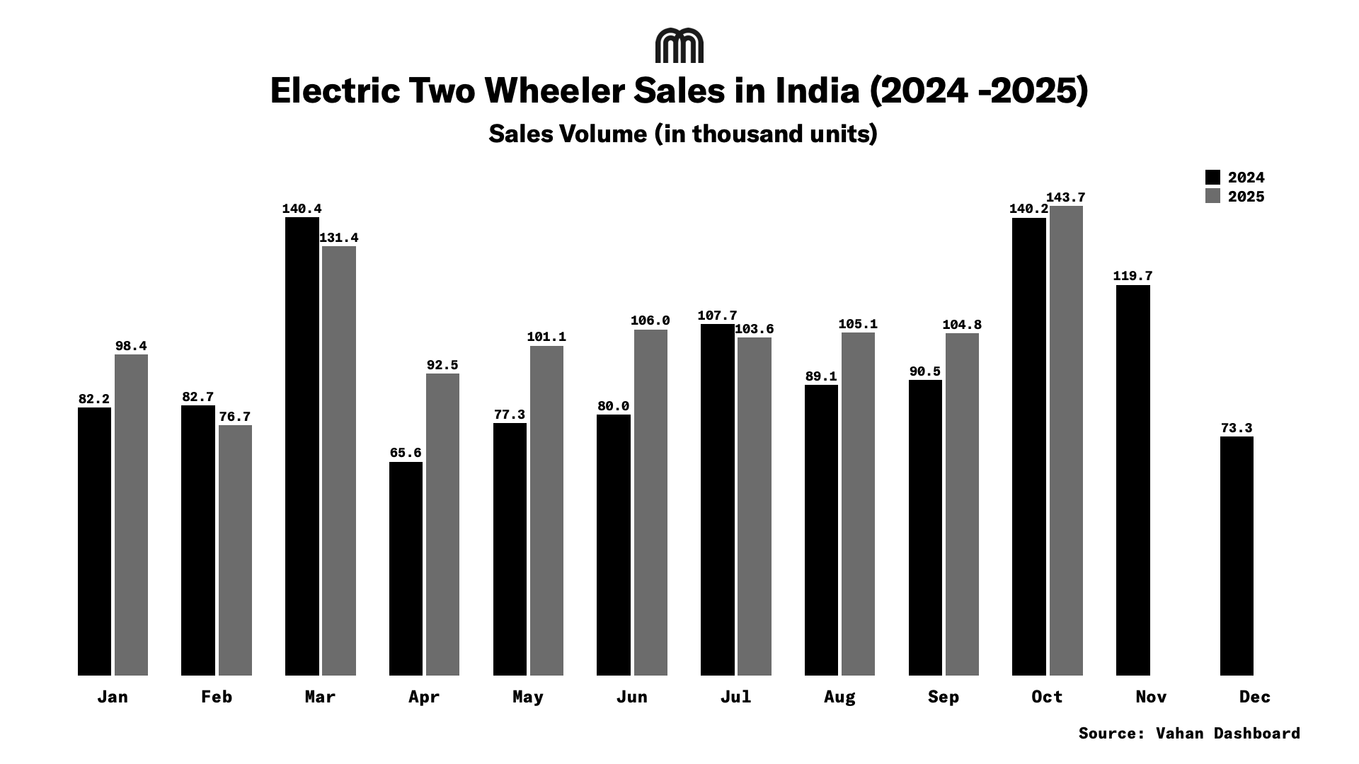 India’s electric two-wheeler market achieved a new milestone in October 2025, registering a record high of 143.7k units sold. This figure surpasses the previous bests of March 2024 (140.3k) and October 2024 (140.2k). The surge also pushed year-to-date sales past 1.06m units, marking an 11% increase compared to the January-to-October period in 2024.