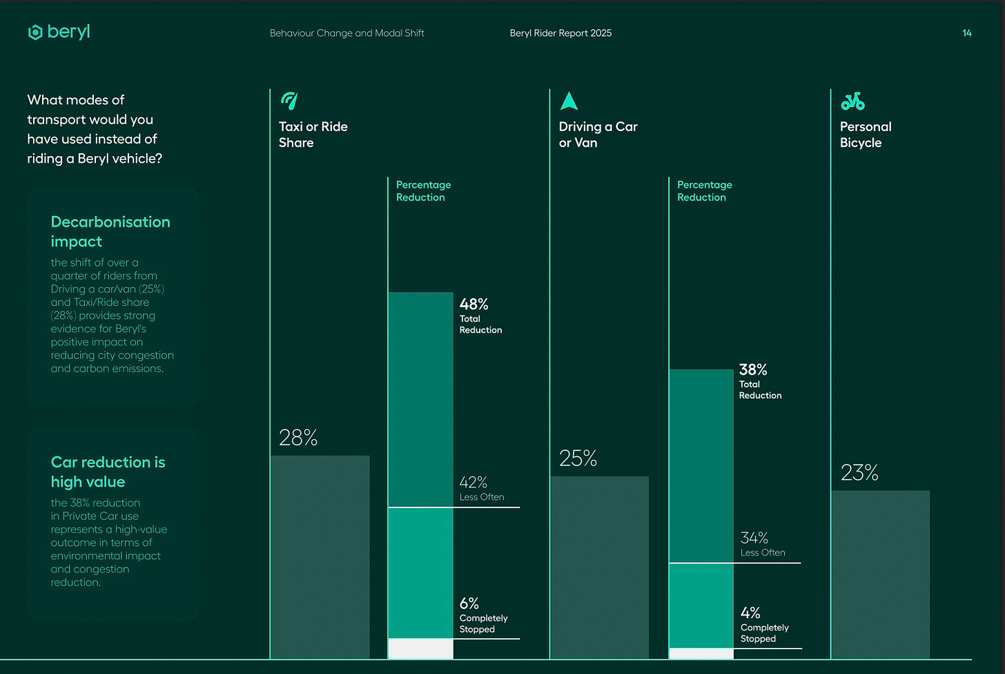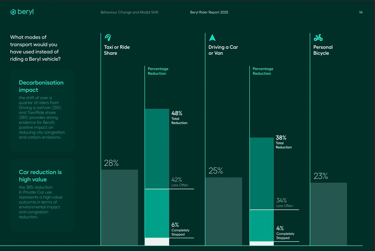 Beryl’s latest Rider Report reveals that shared bikes, e-bikes, and e-scooters are now a routine part of everyday travel across the UK. With more than 11.3k responses across 17 locations, the report highlights a clear shift away from private vehicles, nearly 62% of riders say their Beryl trip replaced one that would have been made by car, taxi, or van. The data shows this shift is driven primarily by reduced car/van and taxi or ride-hailing use. Convenience is now the top reason people choose Beryl, and 41% of users say it’s their first choice for their most common journeys. E-bikes lead in popularity, with more than half of riders preferring them when given a choice, while the service also plays an important role in affordable transport options, with a notable share of riders on lower incomes or identifying as having a disability.