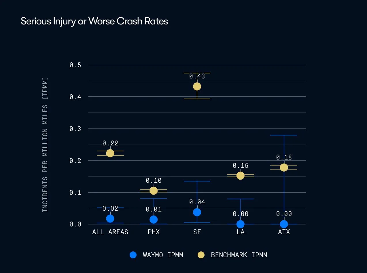 Waymo has updated its public Safety Impact dashboard with data from 170.7m autonomous miles driven through December 2025, showing its vehicles were involved in 92% fewer serious injury crashes and 82% fewer injury-causing crashes overall compared to human drivers in the same cities - Phoenix, San Francisco, Los Angeles, and Austin. Reductions were also significant for vulnerable road users, with 92% fewer pedestrian injury crashes, 85% fewer cyclist injury crashes, and 81% fewer motorcycle injury crashes. Airbag deployments, a key indicator of crash severity, were 83% lower across all vehicles involved in Waymo crashes.