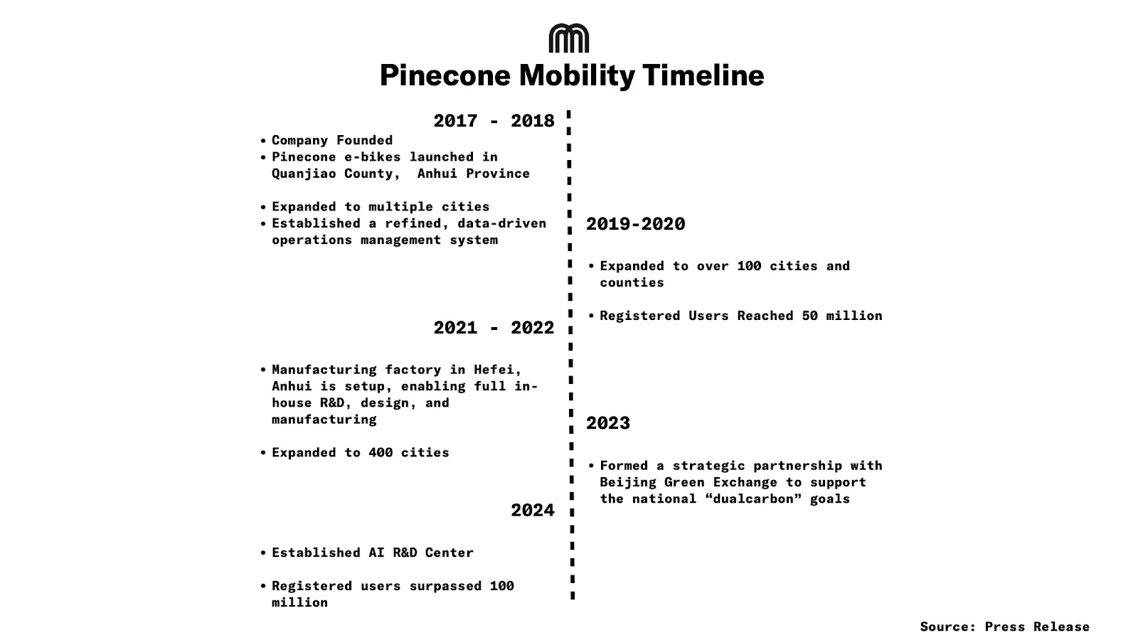 Pinecone Mobility (also known as Songguo Mobility) was established in 2017 as a shared electric bike (e-bike) services provider in China. The company launched its first fleet in Quanjiao County, Anhui Province, and over time expanded rapidly across the country. Its management team anticipated evolving micromobility needs and leveraged data-driven operational strategies to scale nationwide. As of September 30, 2025, Pinecone had deployed 454.6k shared e-bikes across 422 cities and counties in China, making it a leading operator in the sector.