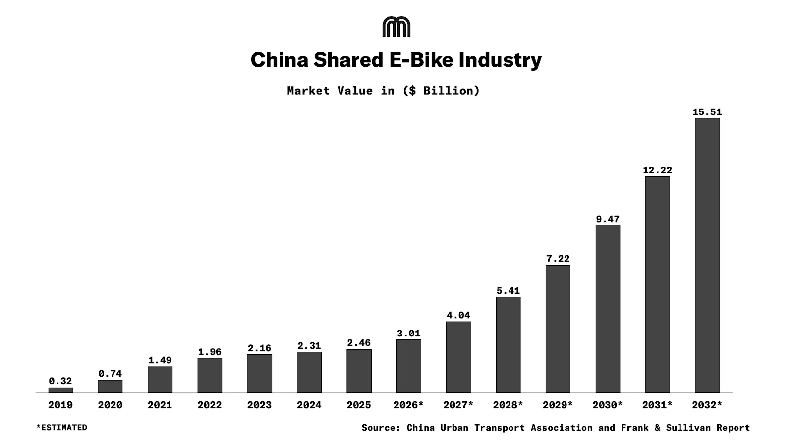 China’s shared electric bicycle market has expanded rapidly as operators improve intelligent dispatching and utilization, lifting daily revenue per bike. Transaction volume grew from $320m in 2019 to $2.3B in 2024, representing a 49.7% CAGR. The industry is projected to reach $15.1B by 2032, growing at a 26.4% CAGR, highlighting strong long-term demand for shared micromobility.