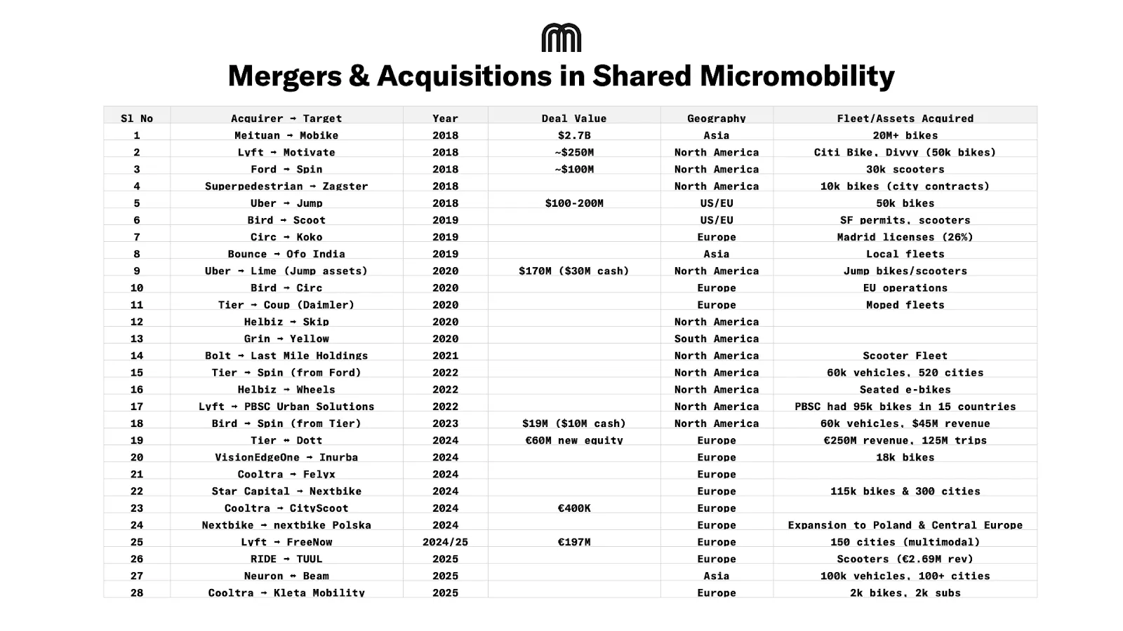 Europe and North America's shared micromobility markets consolidated through 30+ M&A deals since 2017, reducing fragmented competition to regional champions.