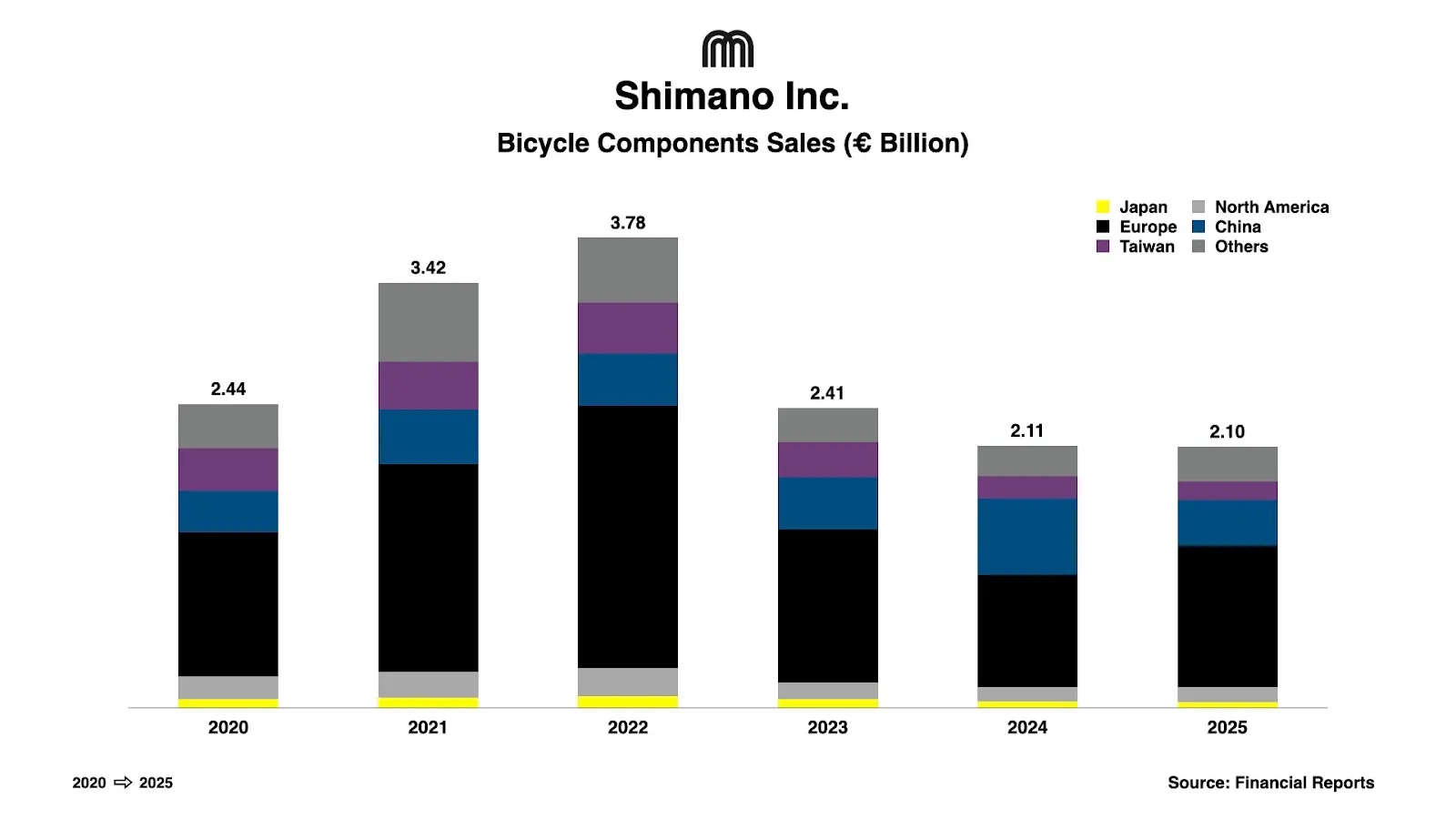Europe continued to drive the bulk of sales, contributing €1.14B. Favorable weather across the region encouraged people to buy completed bicycles, which kept retail sales steady throughout the year. Despite this movement, the supply chain still carries a heavy load, as inventory levels in European channels remain high