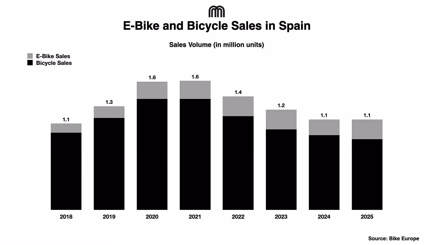 Spain’s bicycle market is starting to steady after a sharp post-pandemic comedown, but the reset is still playing out. Total sales dropped to 1.1m units in 2025, a steep fall from 1.6m units in 2021, when the market comprised 1.35m bicycles and 0.22m e-bikes, as the industry continues to work through excess stock and softer demand. By 2025, that mix had shifted to 0.86m bicycles and 0.24m e-bikes, highlighting a gradual move toward electrification during weaker demand periods.