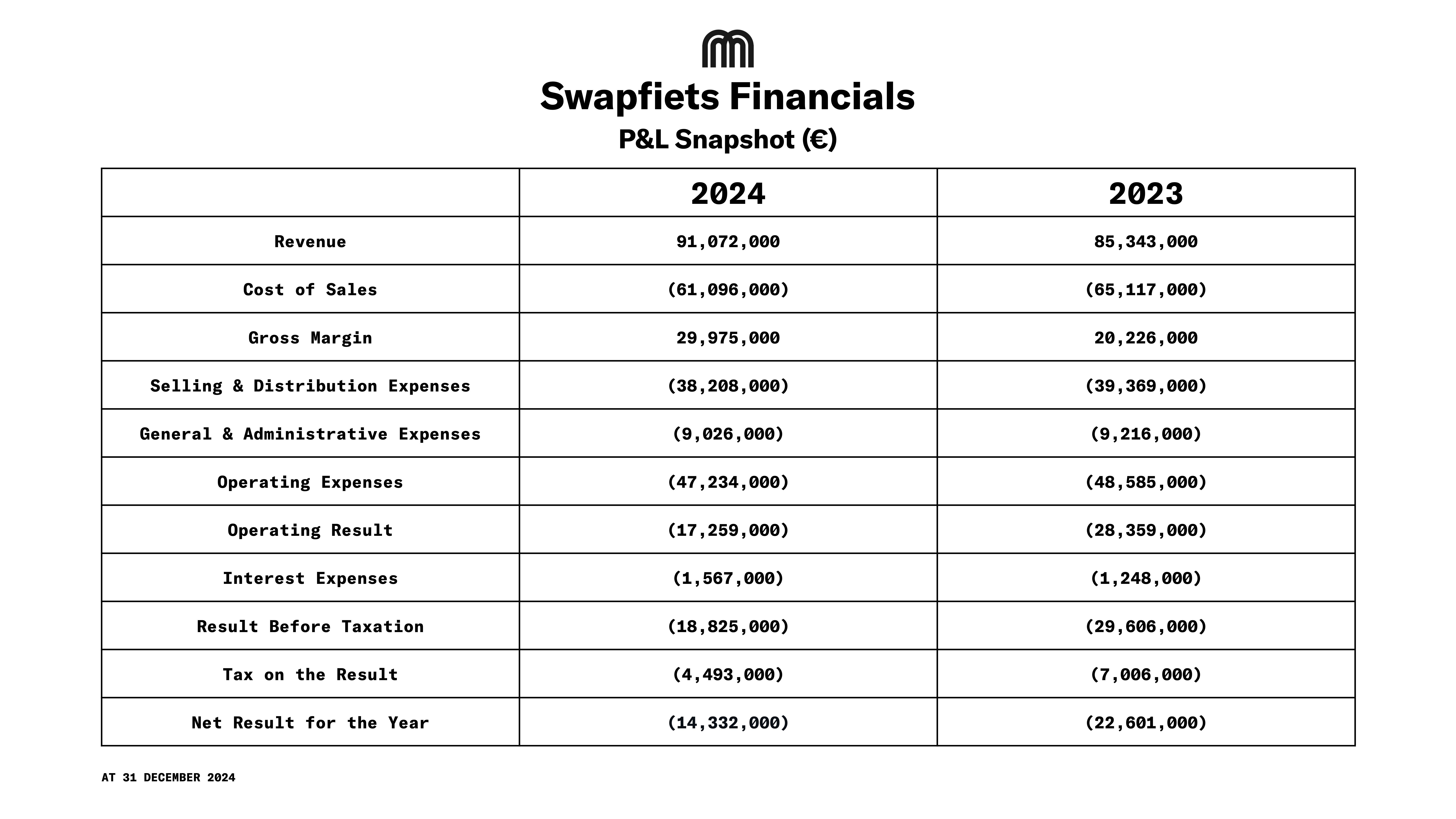In 2024, Swapfiets achieved what it had been working toward for years: growing revenue while reducing absolute costs. Despite a 7% increase in revenue to €91.1m, total cost of sales decreased to €61.1m from €65.1m in 2023, primarily driven by significantly improved recovery rates for stolen bikes and reduced bad debt losses.