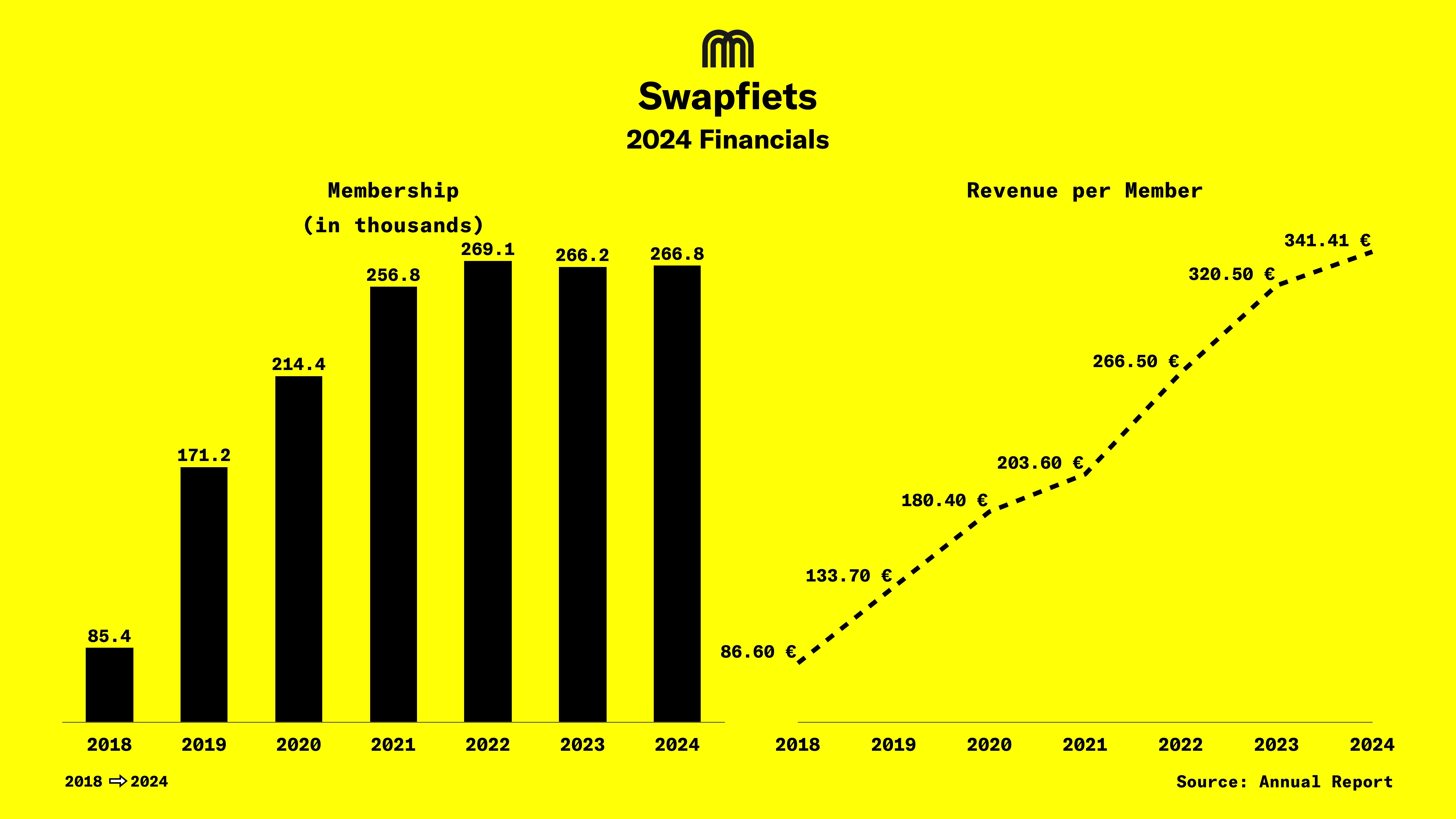 Despite revenue growth, the total membership base remained flat at ~266.8k (from 266.2k in 2023). This indicates that revenue growth was driven by upselling existing and new members to higher-value e-bike plans. Average Revenue Per Member (ARPM) has been consistently growing and reached an all time high of €341.41, up 6.5%. At the recent Micromobility Europe Conference in Brussels, Marc De Vries, CEO of Swapfiets mentioned that the average span of a user is ~2years.