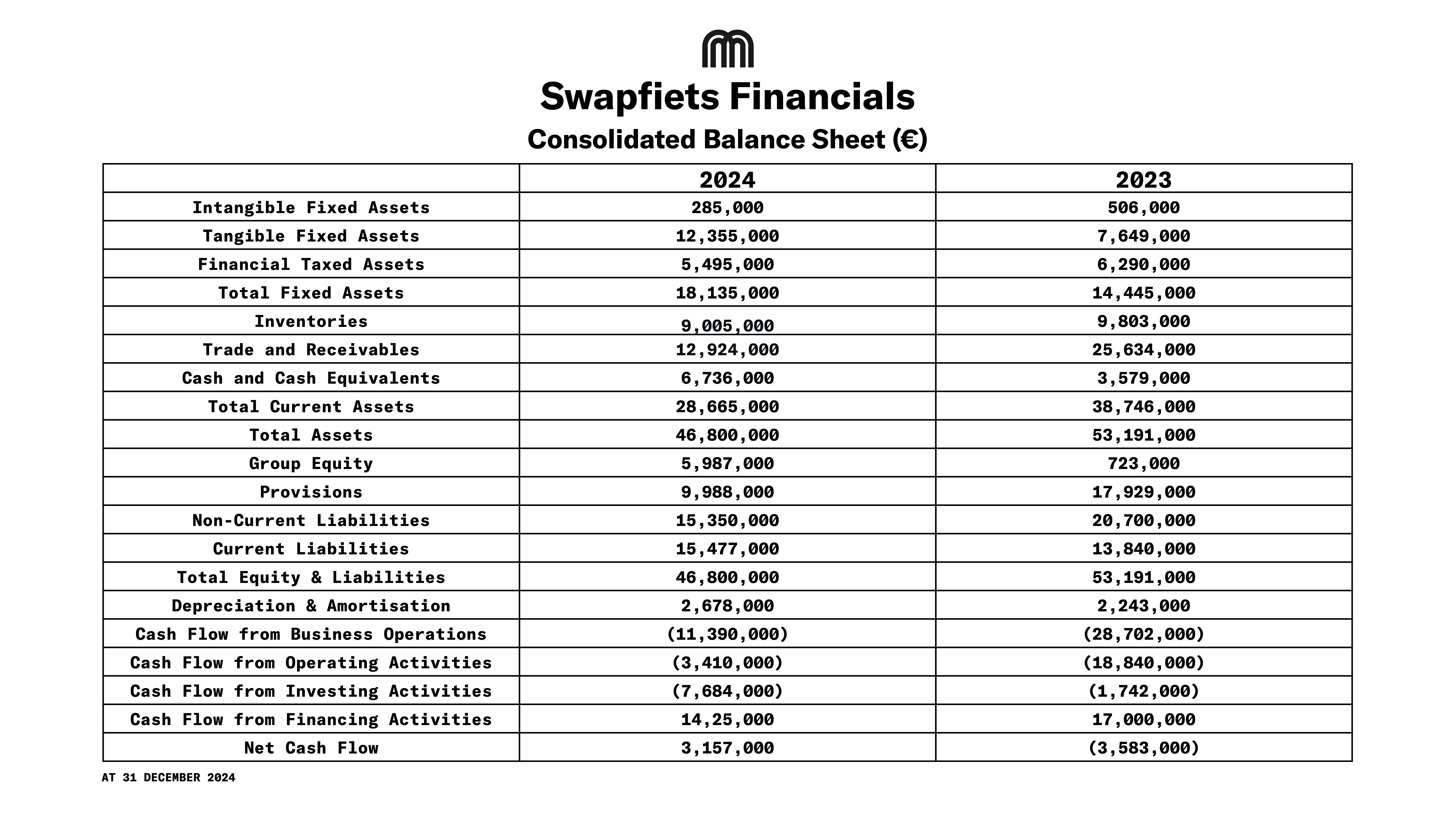 Swapfiets was net cash flow positive in 2024 with €3.15 in net cash, a recovery from €3.5m in negative cash flow in 2023. Cash flow from business operations was negative at -€11.9m, while operating cash flow (after interest and taxes) improved to -€3.4m in 2024, a significant recovery from -€18.8m the previous year.