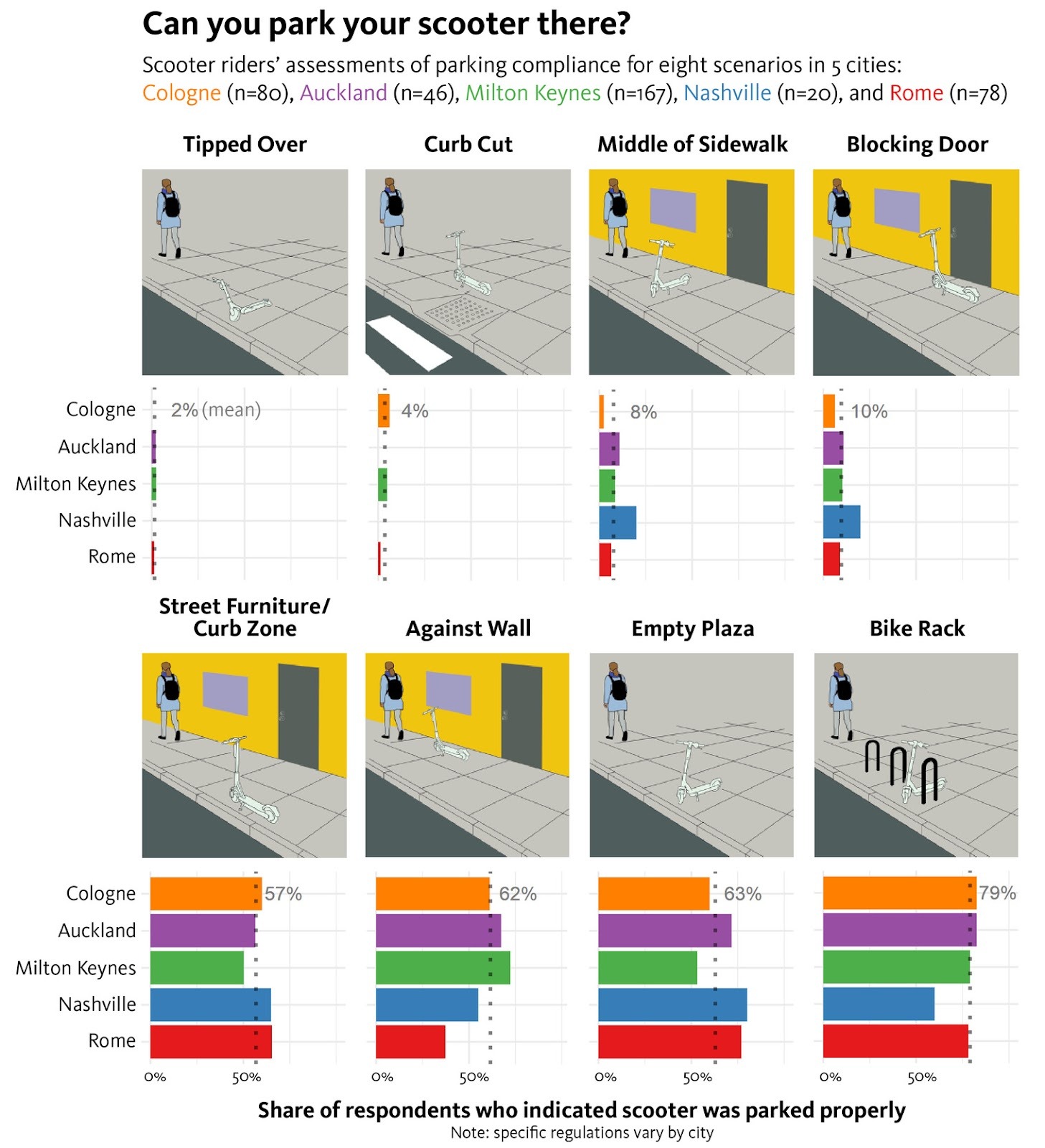 A survey of 391 e-scooter users across Auckland, Cologne, Milton Keynes, Nashville, and Rome asked a simple question. Have you ever misparked?