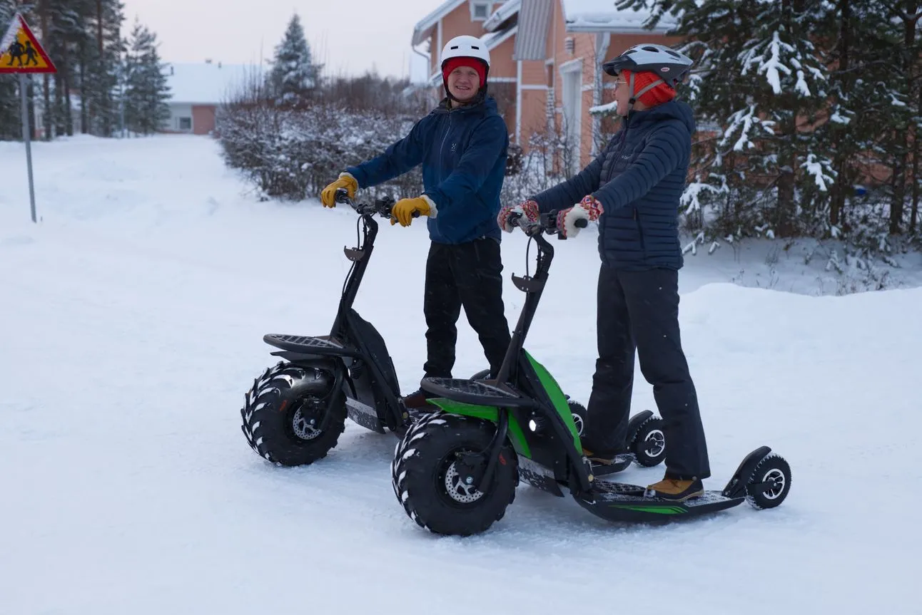 The Skick is an imposing new mobility vehicle from Finnish startup Arctic Rides Oy. It’s like a kick scooter (hence the “kick” part of the name name), but with a giant off-road tire up front, and two small wheels in the rear of the split standing platform. The rear wheels fold up to allow skis to take over when riding on snow. Amusingly, it’s claimed to be easy to propel only by kick power… but we wouldn’t want to try with that curb weight of 65 kg (143 lbs).