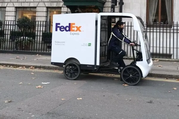 Is it still an e-bike if it has four wheels? FedEx is rolling out newly designed delivery vehicles in London, built by Electric Assisted Vehicles via a grant from the UK Department for Transport. These large pedicabs have a massive cargo bay with a payload capacity of 170 kg (375 lbs), and offer 72 km (45 mi) of pedal-assisted range on a single battery charge.