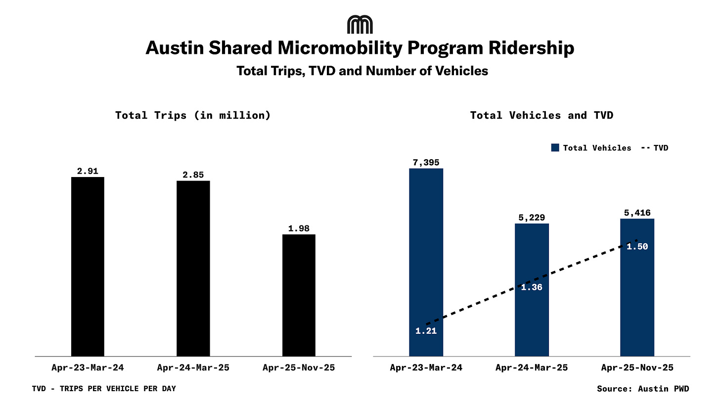 Austin has proposed opening its e-scooter program to new vendors while keeping a two-operator cap. The city currently works with Lime and Bird. The proposal would shift the system from a permit-based model to a contract-based structure, aimed at streamlining oversight and attracting investment. Despite the transition, the number of available scooters fell by more than 2k between 2024 and 2025, even as total trips rose by 6% year over year.
