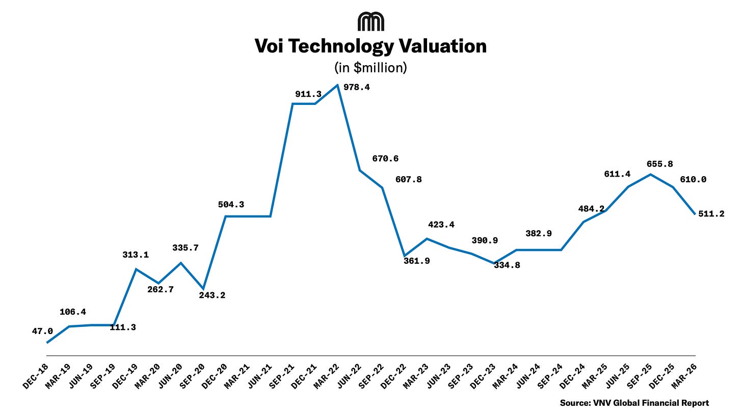 VNV Global valued Voi at $511m at the end of March 2026, down 16% from $610m at end of December 2025. The drop was purely because the stock prices of similar listed companies fell sharply, and the Euro weakened against the Dollar.