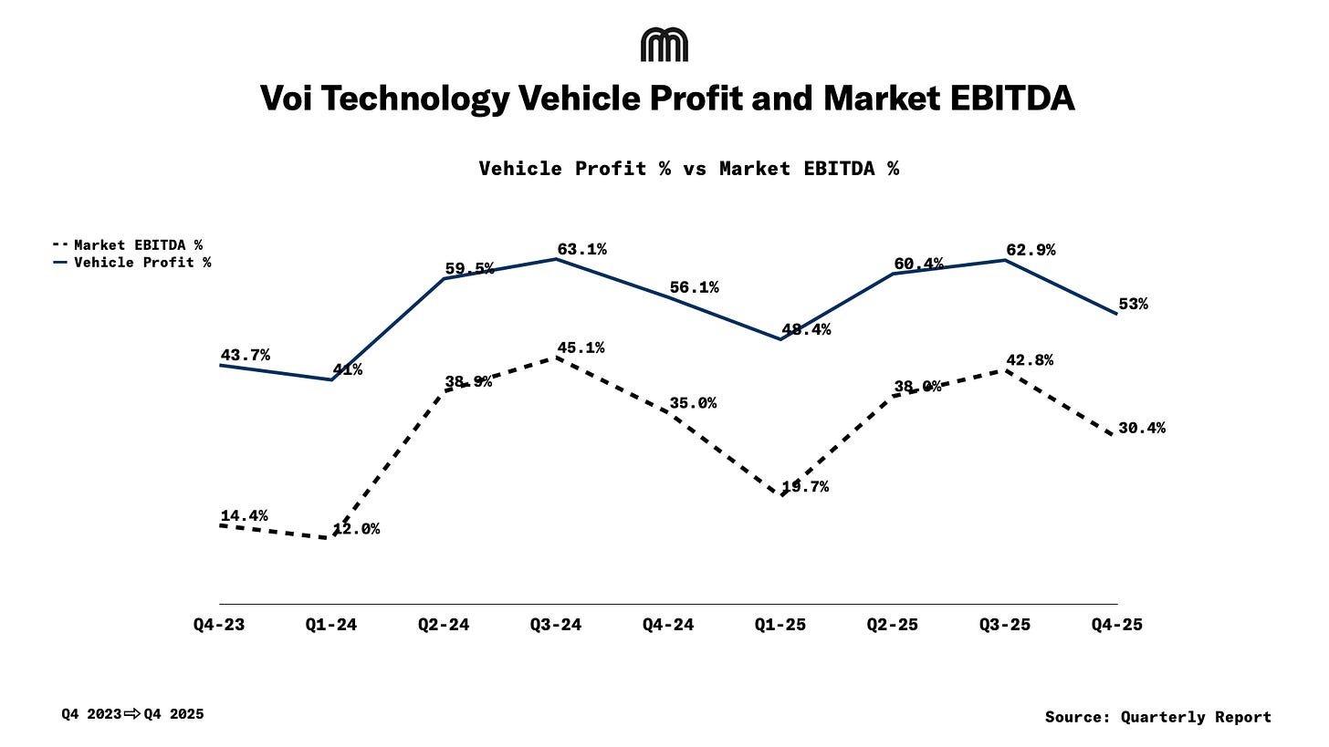 Vehicle profit, what Voi earns per vehicle after the direct costs of operating it, reached €102.4m, a 35% increase from €75.7m in 2024. The vehicle profit margin held steady at 57.5% (vs 57.0%), showing that per-vehicle economics remained consistent even as the fleet scaled.