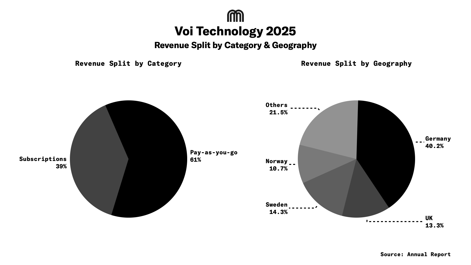 Alongside pay-as-you-go service, Voi offers daily and monthly pass known as Voi Pass, which give riders unlimited access to vehicles up to defined trip caps. In 2025, pass and subscription products grew 65% YoY and represented 39% of total net revenue, up from 31% in 2024. Pay-as-you-go rides remained the largest revenue stream, accounting for €109.2m in leasing income (services recognized at a point in time), while subscriptions (Services recognized over a period of time) accounted for €69.1m.