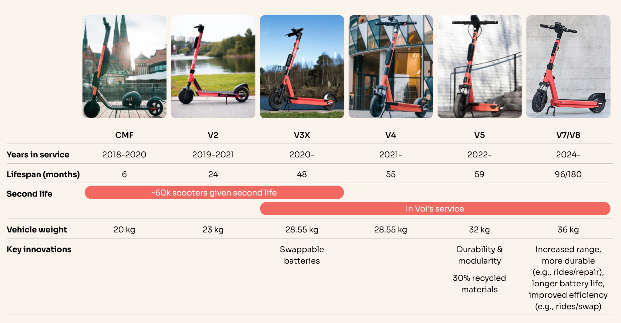 Voi owns its vehicle fleet outright and treats hardware development as a core operational lever. Each generation of the Voiager scooter line and Explorer e-bike line has been designed to Voi’s own specifications, with a focus on lowering the cost of operating each vehicle while extending its working life. Voi works with a limited number of external manufacturers to produce its vehicles, while developing key systems such as its IoT platform and firmware internally.