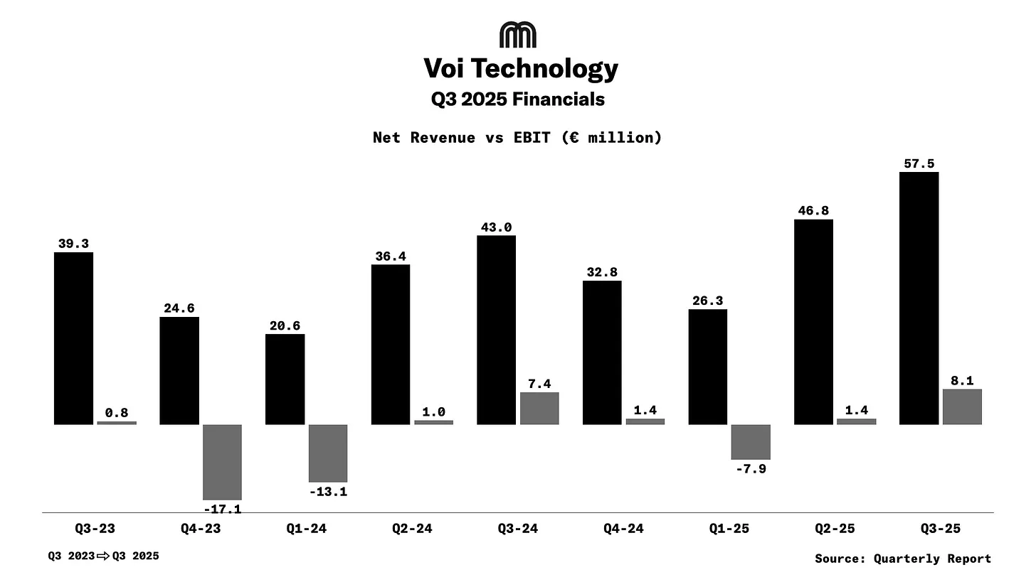 Swedish micromobility operator Voi Technology achieved record performance in Q3 2025, with net revenue rising 34% year-over-year to €57.5m. The company also reported its strongest operational cash flow to date at €19.8m.