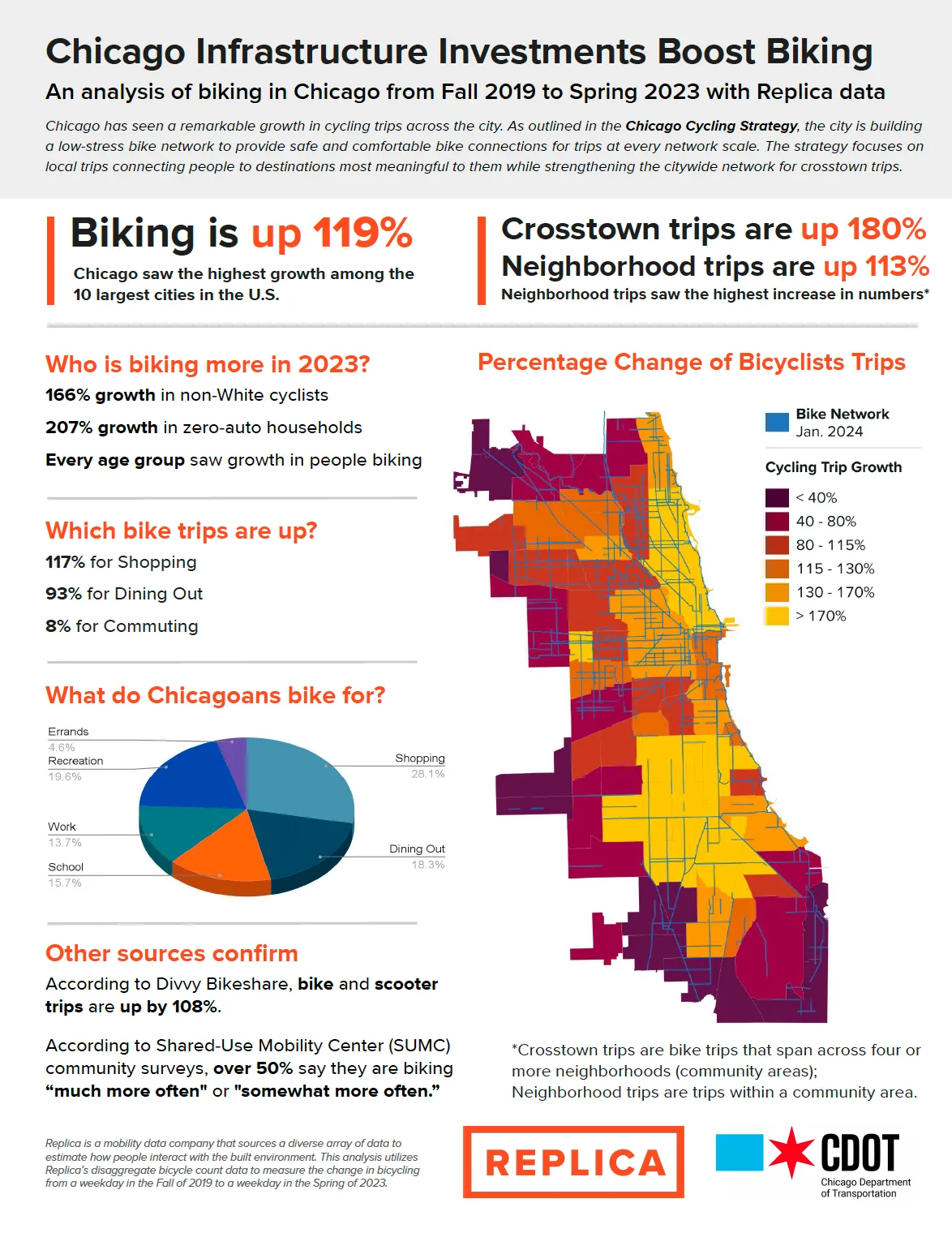 New data shows that Chicago’s investment in cycling infrastructure resulted in a 119% increase in cycling since 2019—the highest growth among the 10 largest cities in the US.
